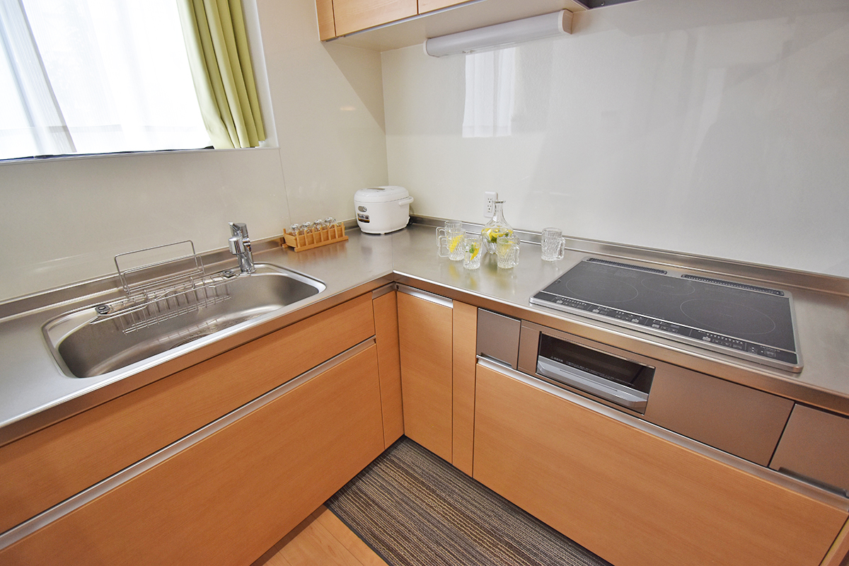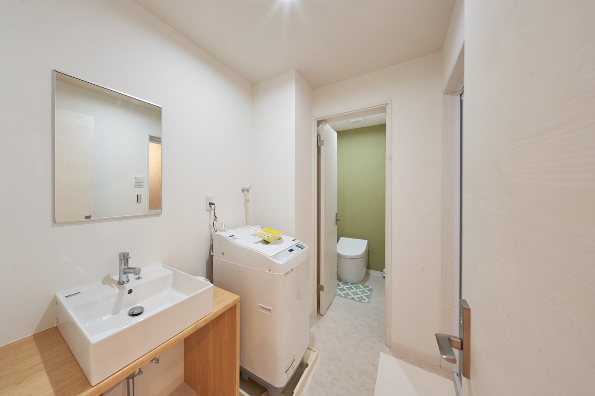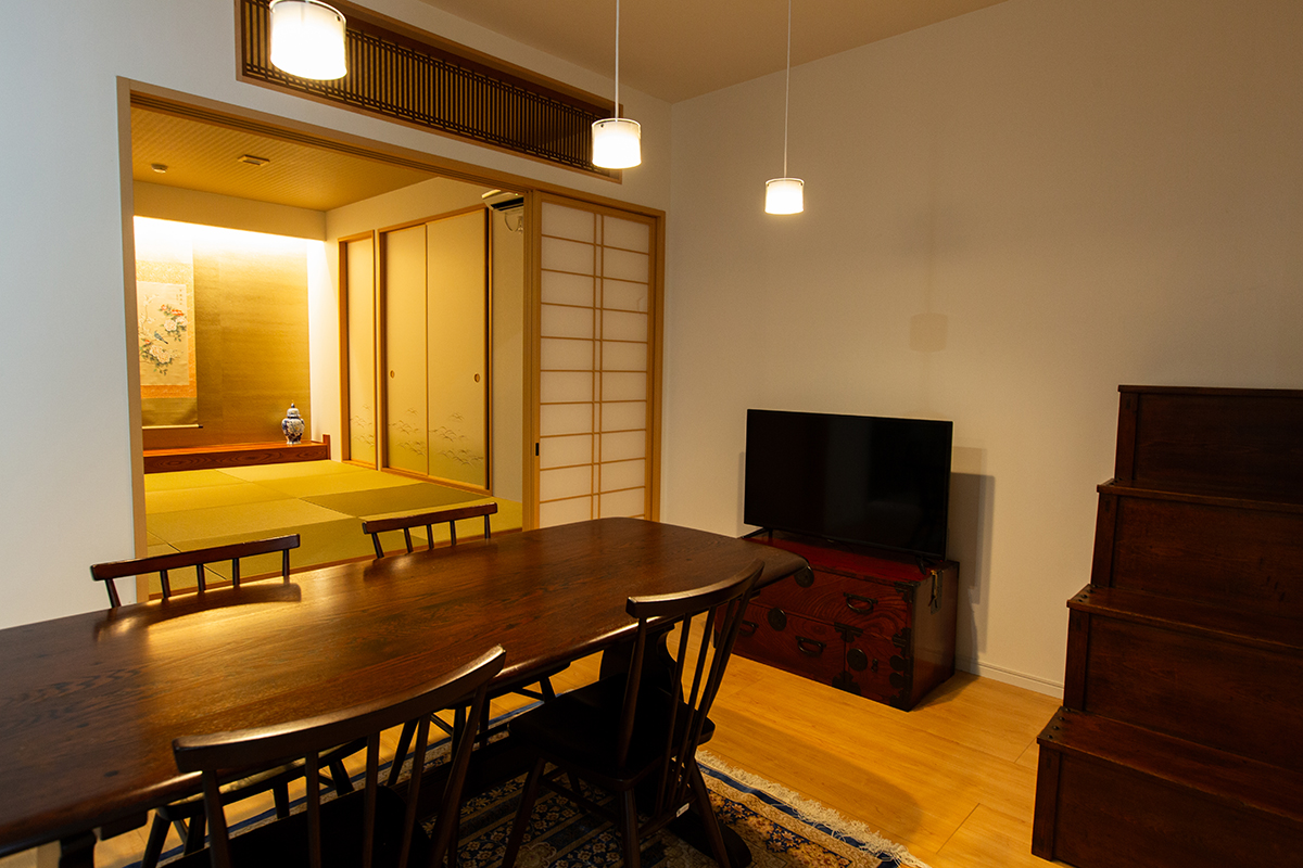 The kitchen was installed in a dead space with an emphasis on design, resulting in a spacious living room and Japanese-style room.